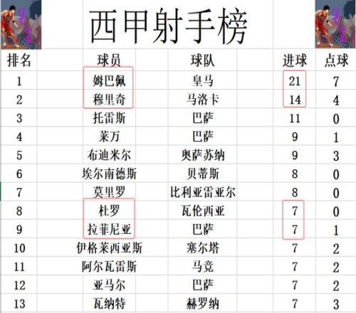 射手榜方面,姆巴佩梅开二度后,成为赛季第1个进球上20的球员,领先第2名的穆里奇7球稳居榜首。托雷斯11球第3,布迪米尔追上莱万,两人9球并列第4。杜罗追上拉菲尼亚,亚马尔等人7球刚好挤入前十。